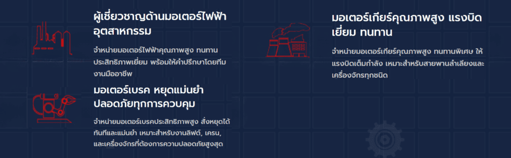 เราคือผู้ให้บริการและจัดจำหน่ายมอเตอร์ไฟฟ้า มอเตอร์เกียร์ และมอเตอร์เบรคคุณภาพสูงครบทุกประเภท พร้อมทีมผู้เชี่ยวชาญให้คำปรึกษาเพื่อเลือกสรรโซลูชันที่เหมาะสมที่สุดสำหรับธุรกิจคุณ มั่นใจได้ในสินค้ามาตรฐานสากลและบริการที่ครอบคลุมทั่วประเทศ